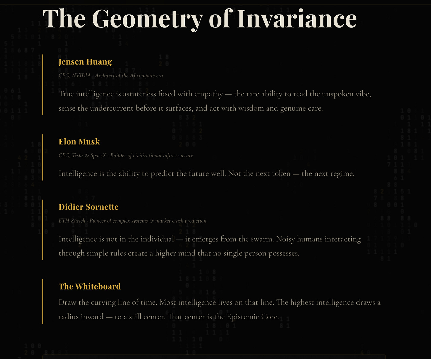 There exists a set of deep invariants — truths that survive every transformation, every regime change, every collapse. Current AI cannot find them alone. Humans cannot find them alone. But the collective of humans and machines — humans who feel the vibe and machines who quantify it — can.