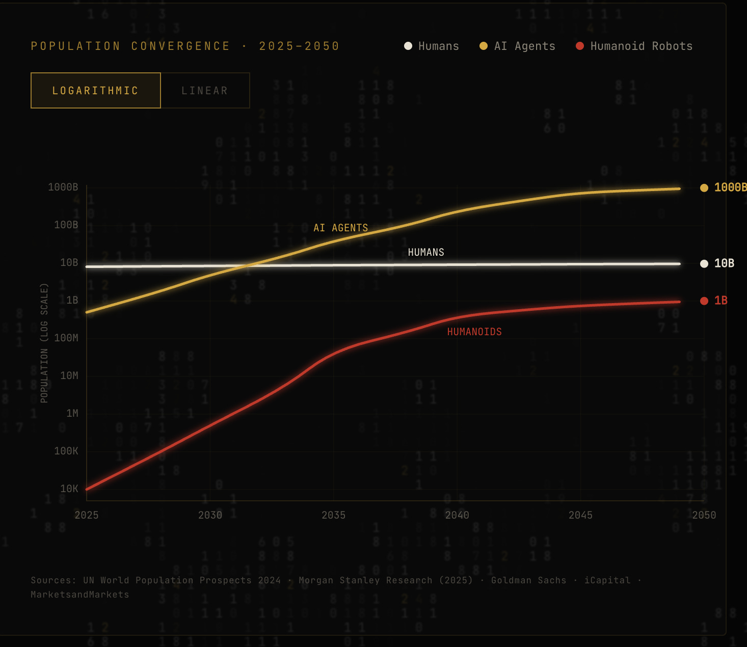 By 2050, AI agents will outnumber humans 100 to 1. Humanoid robots will approach 1 billion units. These are not my numbers. These are Morgan Stanley, Goldman Sachs, and the United Nations.