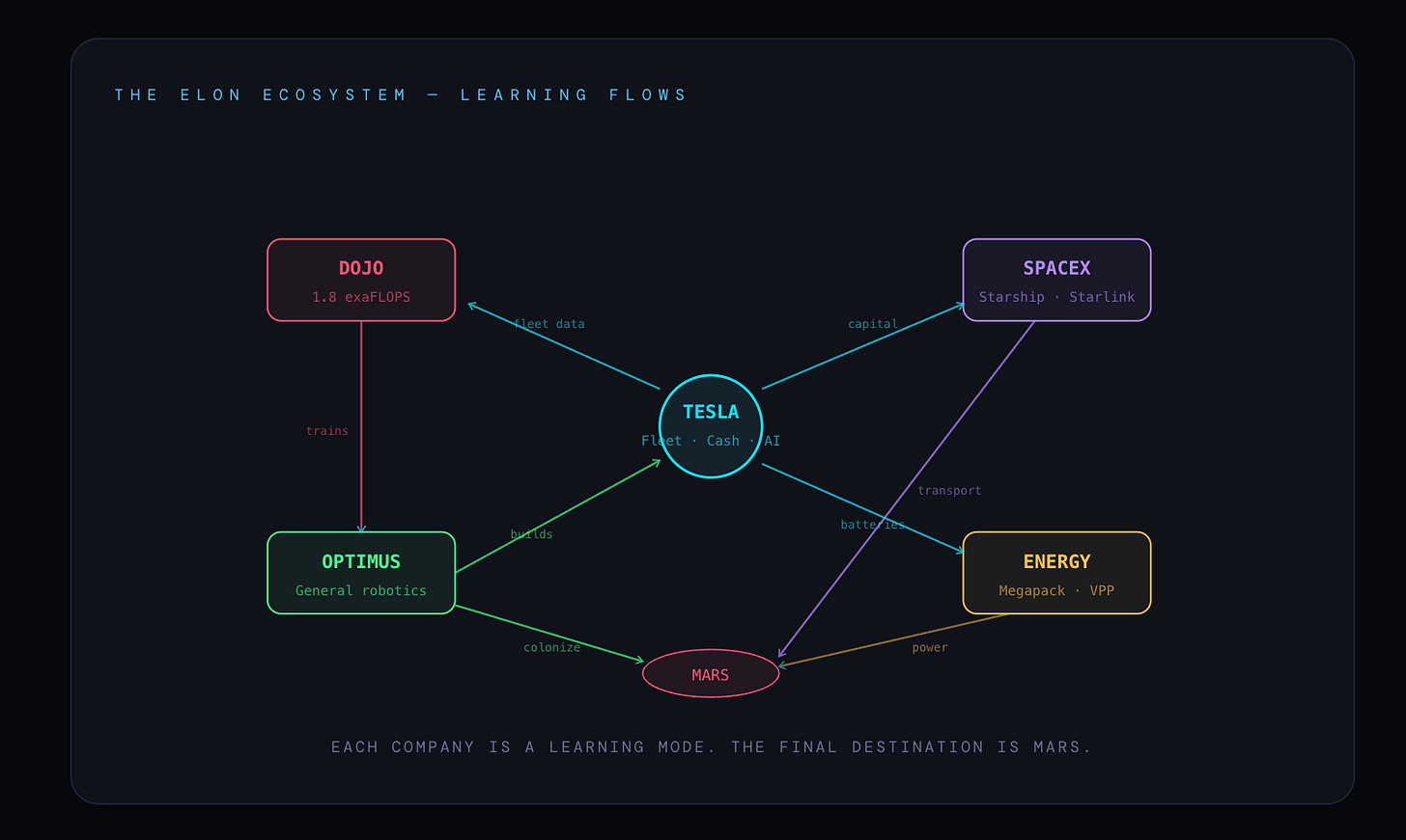 Fleet data → Dojo → Optimus → SpaceX → Mars