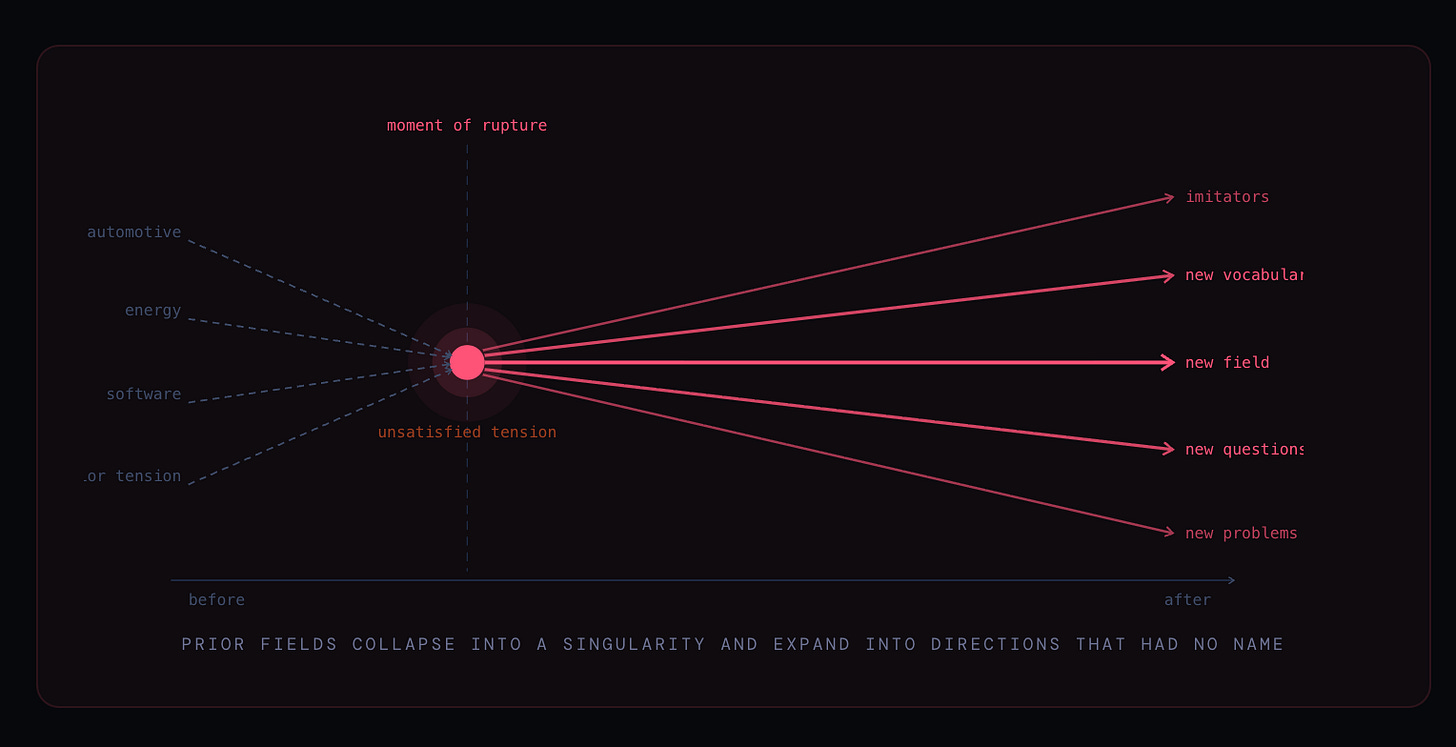 This is not innovation. Innovation happens inside an existing field. This is a new field — multiple fields simultaneously. And the proof that you’ve created a new field is always the same: others begin imitating your language. The cycle restarts — from another plane.