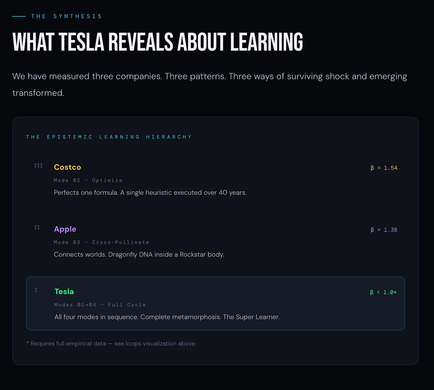 Costco perfects one formula over 40 years. Apple carries Dragonfly DNA inside a Rockstar body — it dies, is reborn, and redesigns the future. Tesla is the complete Dragonfly: each mode compounding on the previous, each crisis producing a metamorphosis, the β of the system accelerating with every loop.