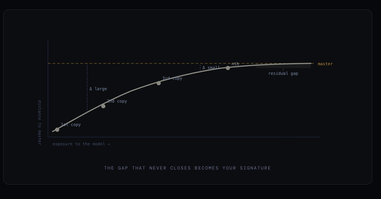 The geometry of imitation is not about rising toward mastery. It’s about converging toward it — asymptotically. Each iteration closes the gap. The gap never reaches zero. And what remains — the residual gap — becomes the fingerprint of your own voice.
