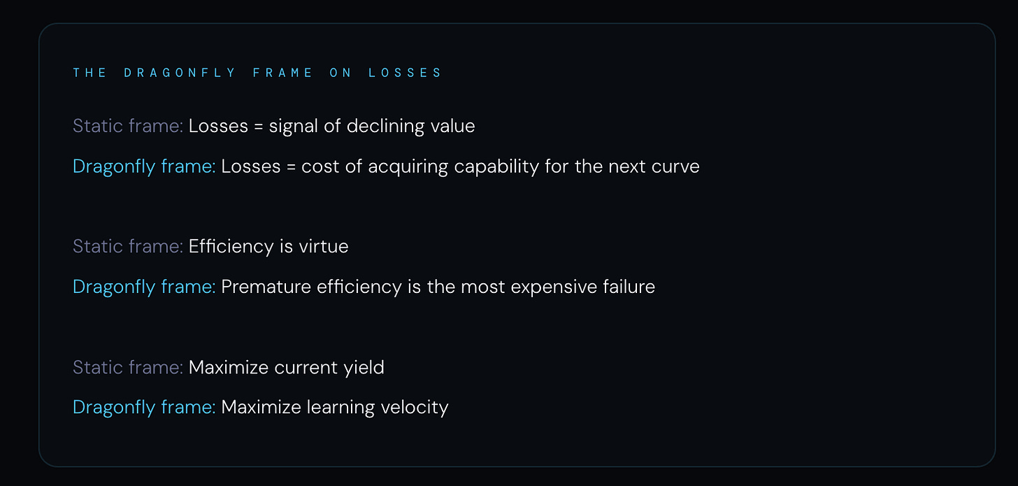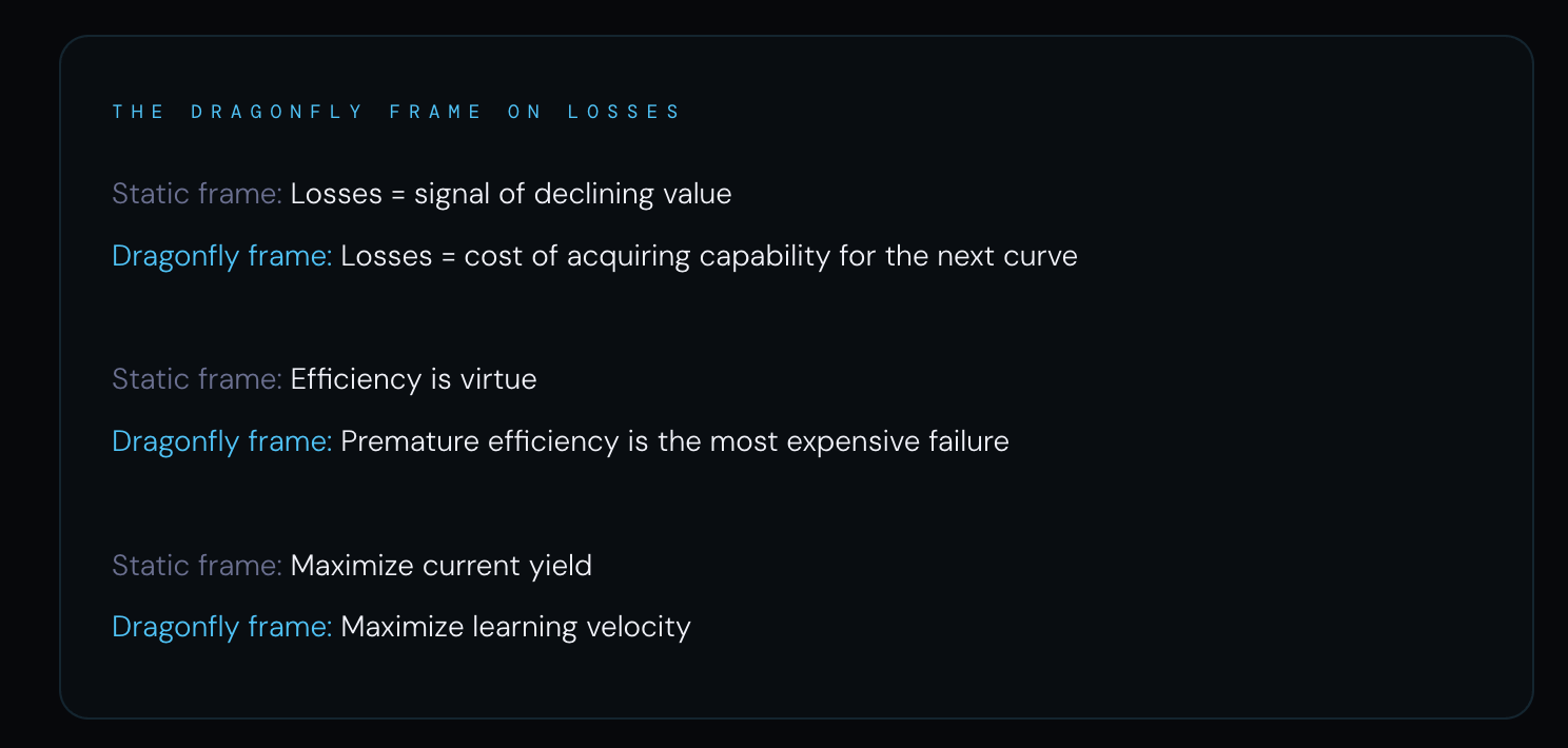 Costco perfects a heuristic (Mode 02). Apple connects worlds (Mode 03). Tesla used all four modes in sequence — imitate, optimize, cross-pollinate, represent — and each one compounded on the previous. That’s why Tesla isn’t a Rockstar with Dragonfly DNA like Apple. Tesla is the complete Dragonfly. The Super Learner.