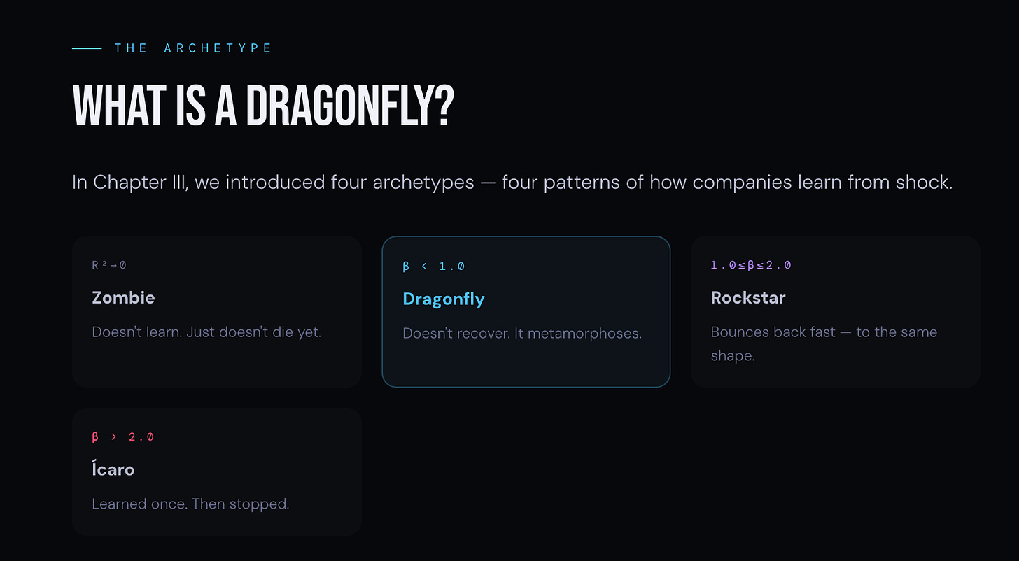 We measure epistemic learning speed using a metric we call β — how fast a company recovers, and how it recovers, from market shocks.