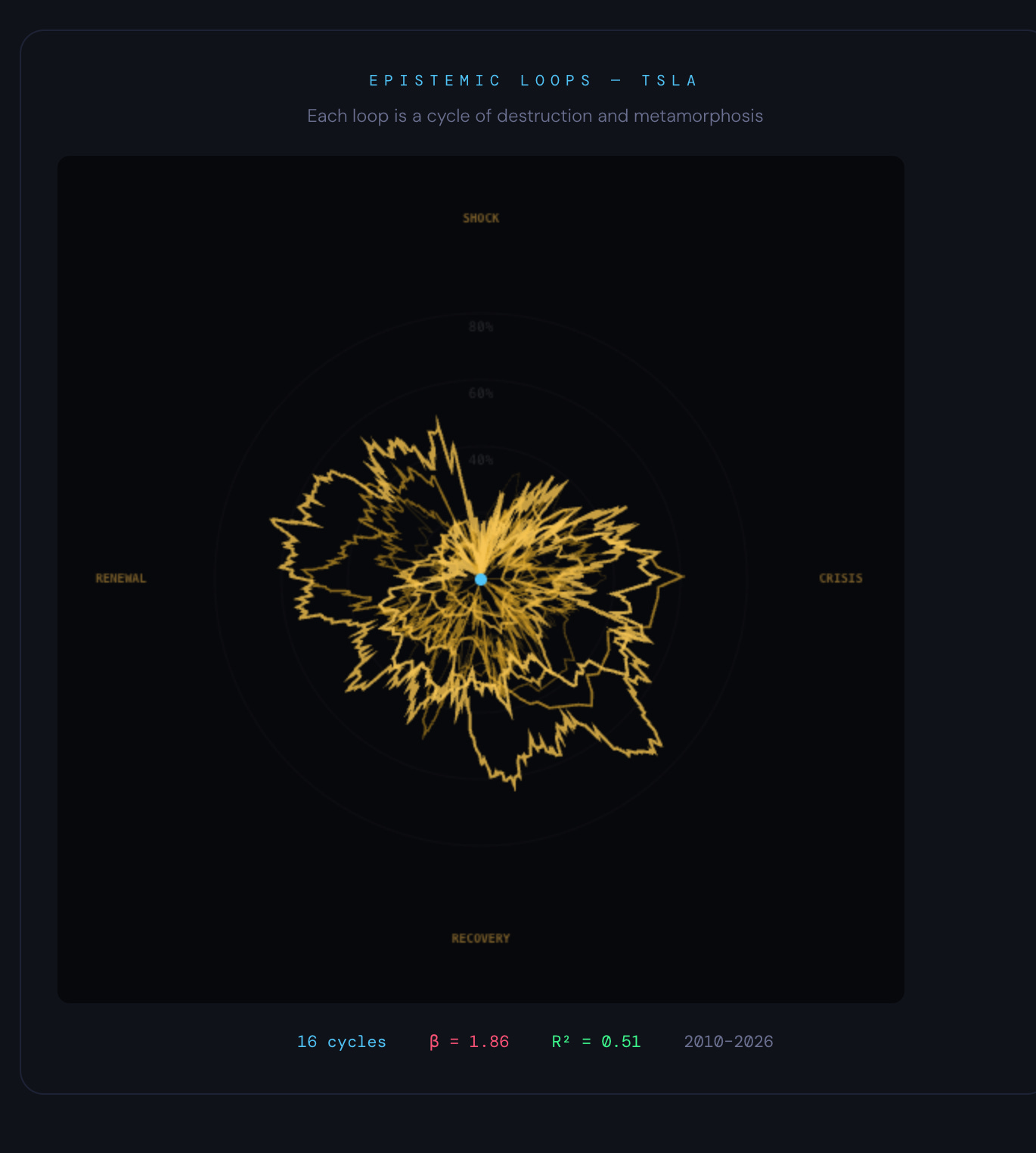 Tesla’s signature is different. 16 epistemic cycles from 2010 to 2026. β = 1.86. R² = 0.51.
