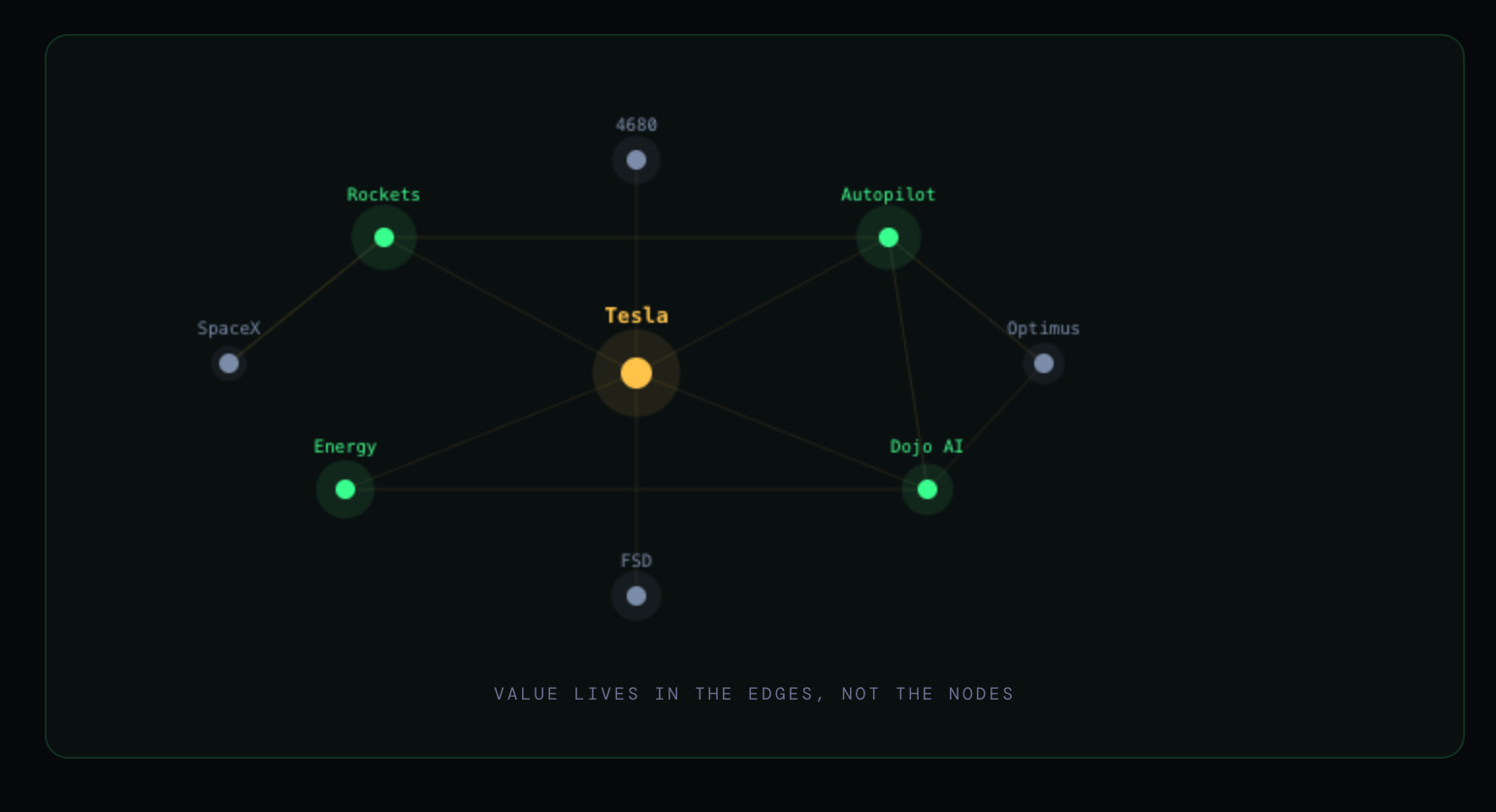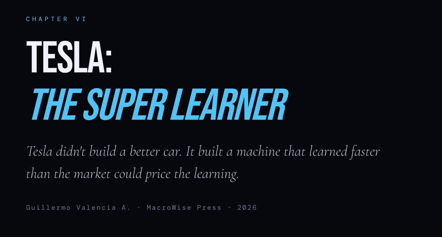 In our taxonomy: Tesla was the worst car company by every static metric. It was the fastest learning system in the history of the automotive industry. Those two facts coexisted for a decade. The market eventually priced the second one.
