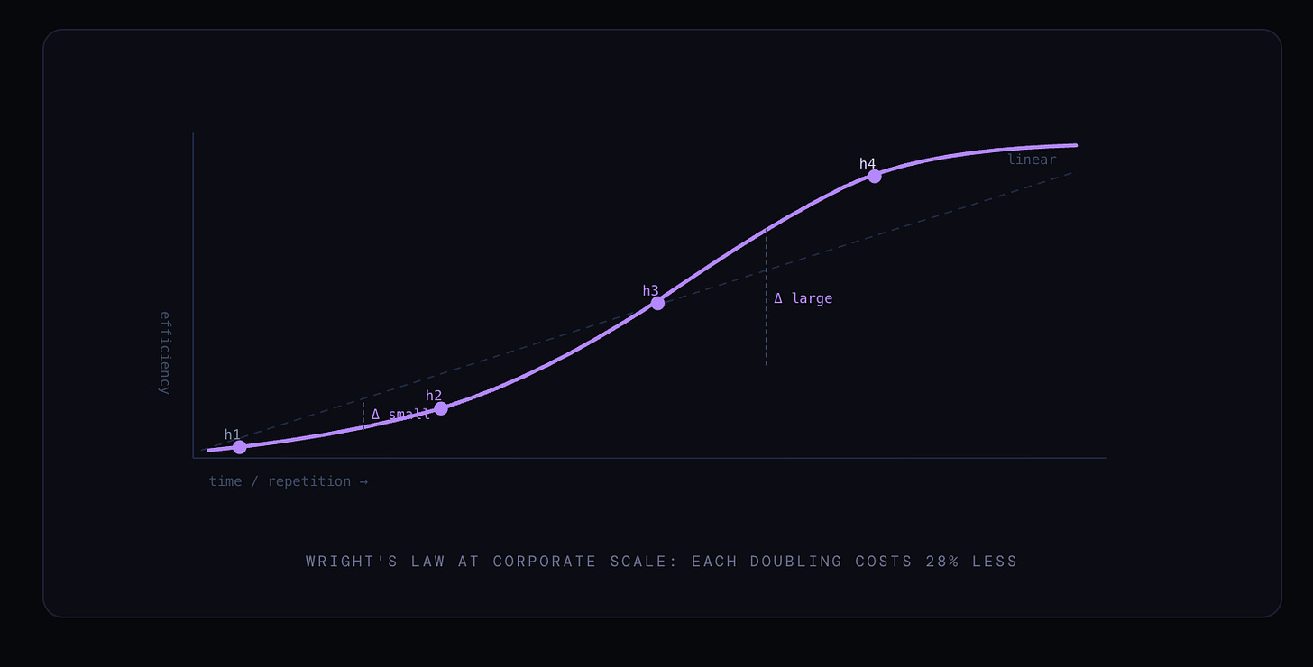 That’s not efficiency. That’s compounding. Each production cycle fed data back into the next. Each doubling of output generated a 28% cost reduction — Wright’s Law operating at corporate scale.