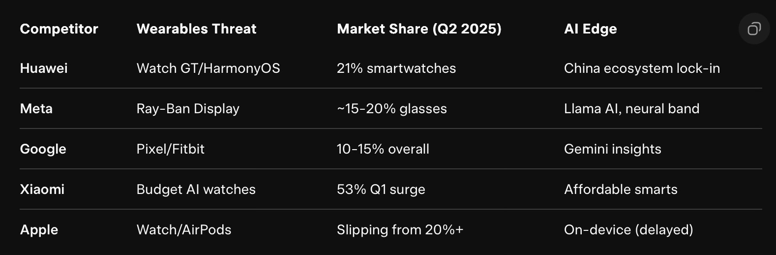 Apple’s story is a stark warning of empire under siege. Its wearables—Watch, AirPods—were meant to own the AI agent interface, where glasses and earbuds anticipate needs. But the numbers are brutal: global wearables hit 136.5 million units in Q2 2025 (+9.6%), yet Apple’s Watch has slumped for six quarters, down 19% in 2024. Huawei seizes 21% of smartwatches, dominating China, where Apple’s phone share lags at 13.9%. Xiaomi surges 53%; Meta’s Ray-Ban glasses, with Llama 4 AI and neural bands, redefine style and smarts. Google’s Gemini (10-15%) and Samsung’s Galaxy AI erode further. Hyperscalers—AWS, Azure, Google Cloud—fuel cloud agents at 37% CAGR, threatening Apple’s 25% services revenue.