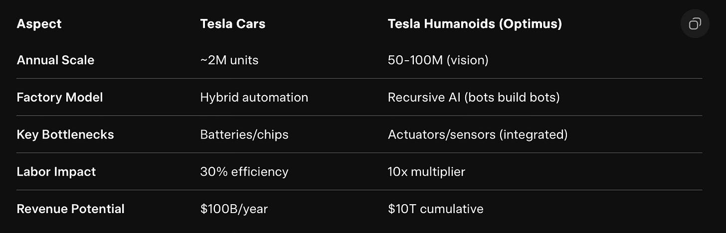 Tesla’s factories—2M cars yearly with hybrid lines—go recursive with bot-built bots, targeting 1M humanoids by 2030. China’s dark factories loom, but Tesla’s ruthless iteration—data over dogma—keeps it ahead.
