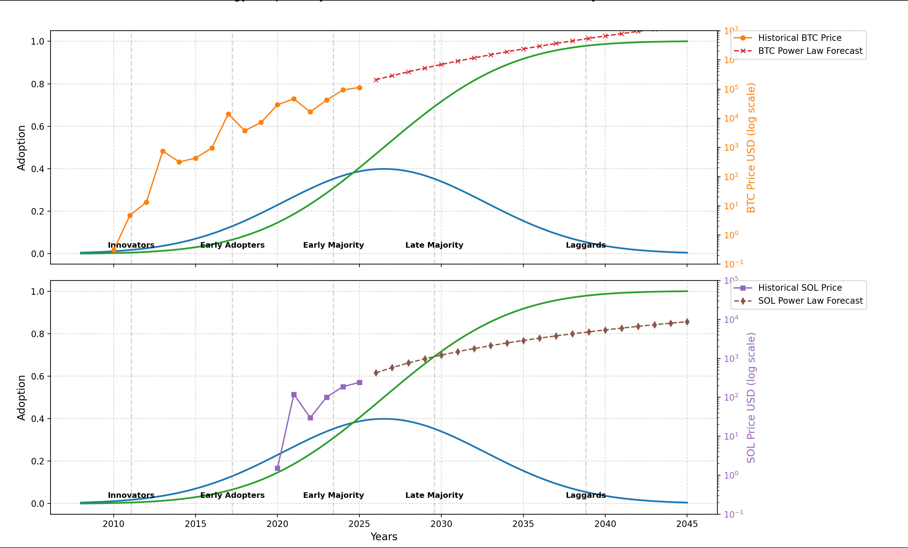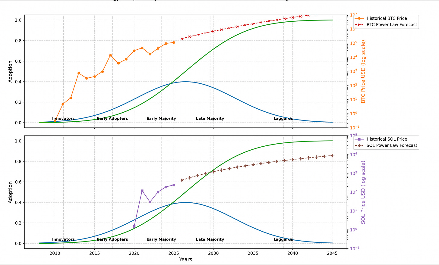 Crypto feels a lot like that today. Bitcoin launched in 2009 as a quirky experiment—"magic internet money," they called it, with more than a few laughs. Then the backlash hit: regulators cracked down, critics labeled it a bubble or worse. But look where we are in 2025: Institutions are buying in, ETFs are flowing, and it's starting to feel inevitable. It's not just about coins; it's the tokenization of everything. Imagine turning real-world assets—houses, art, stocks—into digital tokens on blockchains like Solana. No more endless paperwork or middlemen; you could own a fraction of a Picasso or a Manhattan apartment with a click. This renews the old fiat system, that clunky world of dollars and euros, making finance faster, fairer, and borderless. It's emerging now, in the early majority phase, where the real growth kicks in.The charts tell the tale. In the top graph, Bitcoin's price hugs that S-curve of adoption—starting slow with innovators in the 2010s, accelerating through early adopters in the volatile 2020s. By 2025, it's at $113,130, but the power law forecast (that red dashed line) points to a steady climb: around $208,000 by 2026, $288,000 in 2027, pushing past $1 million by 2031, and hitting an eye-watering $15.7 million by 2045. It's not a straight line; markets never are. But as adoption spreads to the late majority—think everyday banks and pensions—it could make those numbers look conservative.